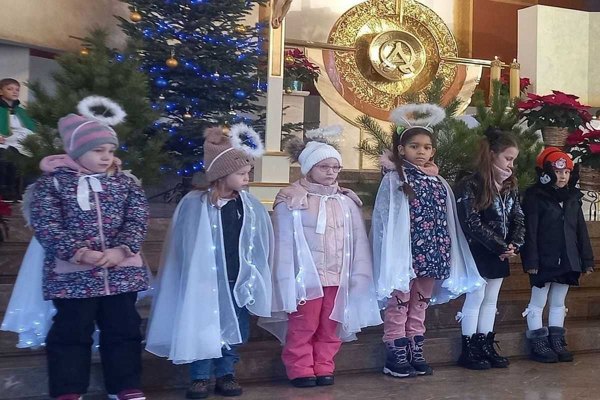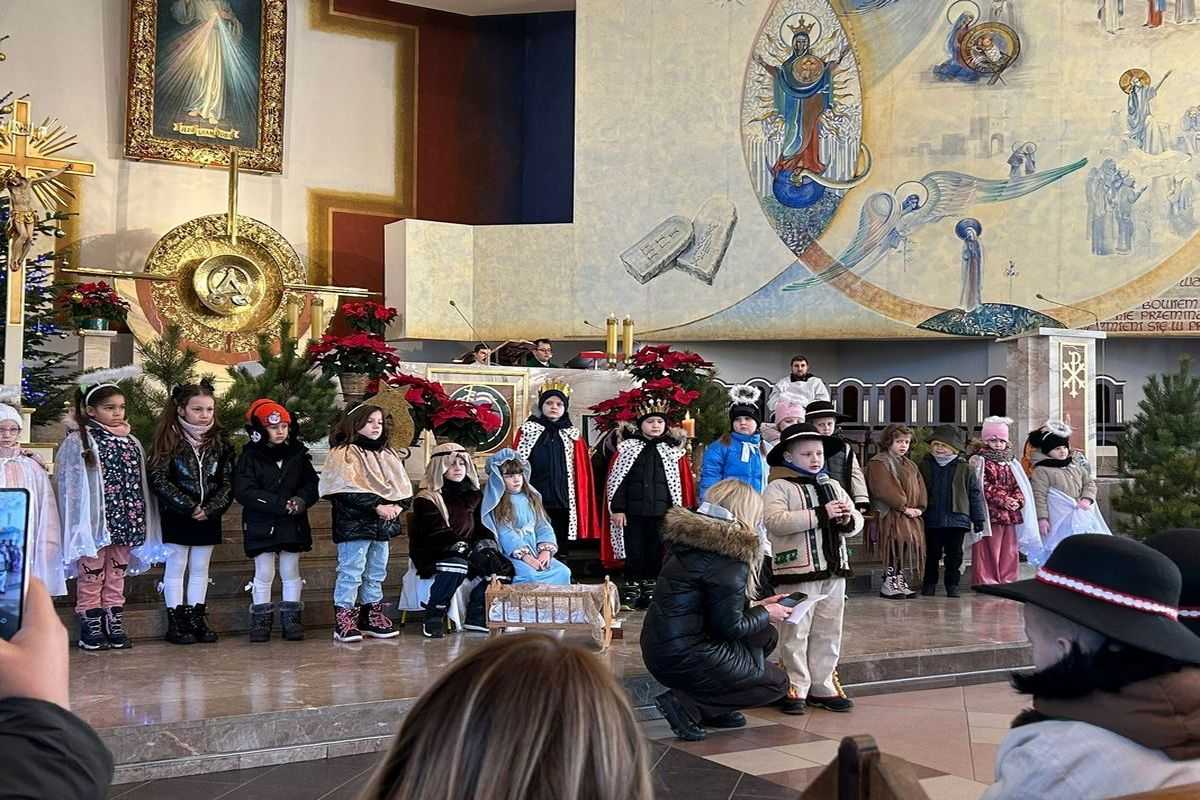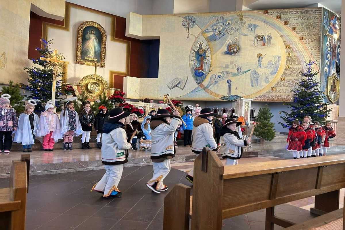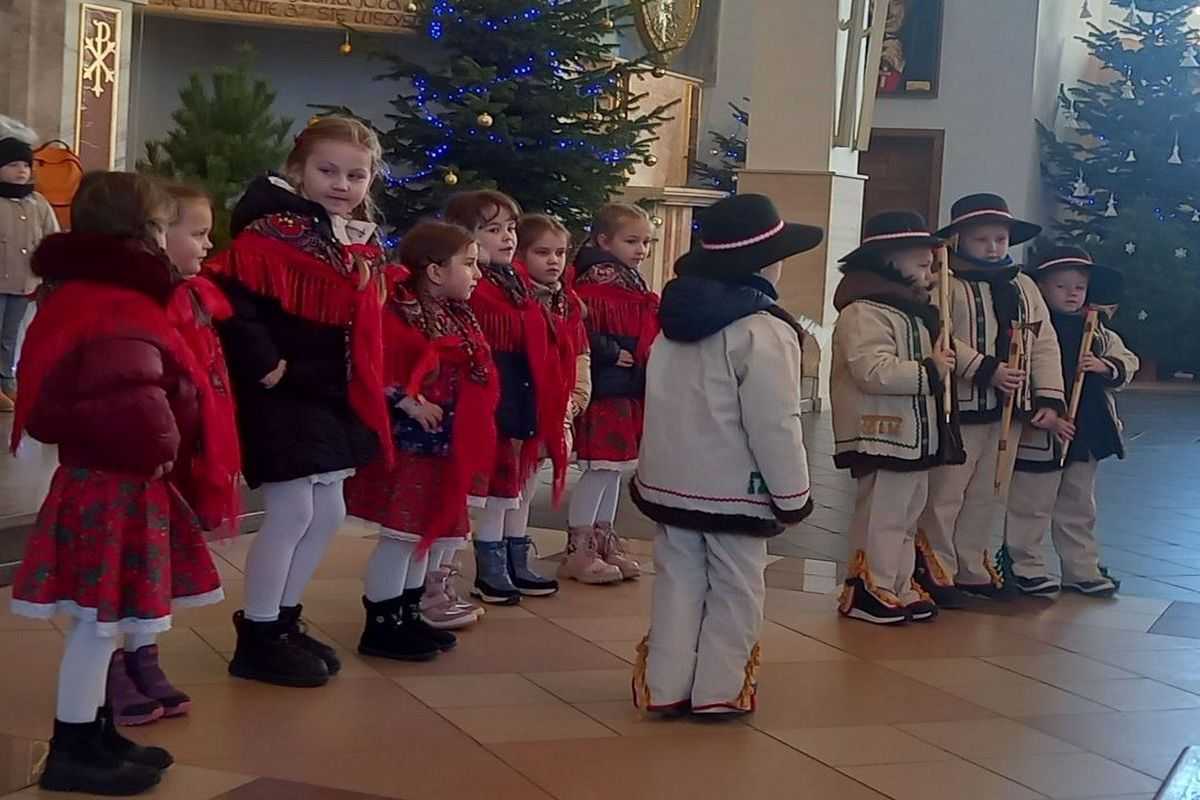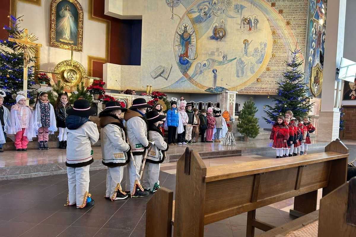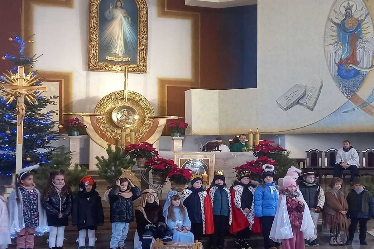 18.01.2026 w Sanktuarium Miłosierdzia Bożego przy ulicy Polnej nasze przedszkolaki z oddziałów: V Sowy, VI Pszczółki, VII Jeżyki, VIII Wiewiórki i IX Niedźwiadki przedstawiły Jasełka pt.:” Cud Narodzin: Historia Bożego Narodzenia” przeplatane pięknymi bożonarodzeniowymi pastorałkami oraz tańcem góralskim. Dzieci 5- i 6- letnie w strojach aniołów, pasterzy, Gwiazdy Betlejemskiej, Trzech Króli pokazały piękno dziecięcej wrażliwości, czym zasłużyły na brawa i słodki upominek. Słowa uznania i serdeczne podziękowanie za wzruszające przeżycia złożył przedszkolakom i ich nauczycielkom ksiądz proboszcz Marek Kumór. Dzieci do występu przygotowały nauczycielki: Małgorzata Połowniak, Agnieszka Fraszczyk, Aleksandra Ziarko, Dominika Bryła, Anna Fonał i Agnieszka Sałkowska pod czujnym okiem  pani dyrektor Anety Stachurskiej.